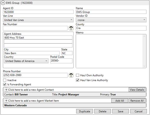 Additionally, if the agent is also considered an international forwarder, then check the Is Forwarding Agent flag. This flag enables certain functionality such as automatic registration and uploads. For example, if the Booking Agent on the order is considered a forwarding agent, then changes made to all related data is included in an UniGroup International Upload.