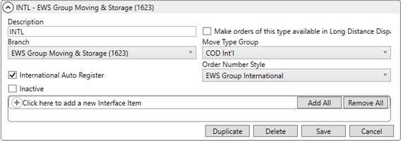 To enable UniGroup International functionality, the order must associate to a branch, van line, and authority established within one of the XML Interface Setup records.