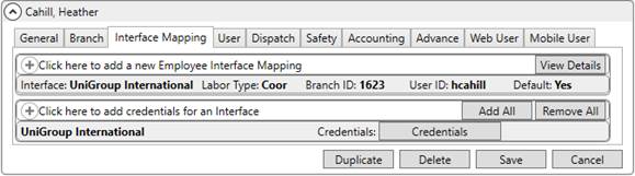 When you add an Interface record, the Credentials option appears. This allows you to enter the UniGroup International identifier for the employee.