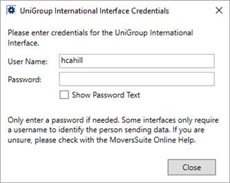 The UniGroup International Upload process requires personnel that register and update orders in MoversSuite to also be linked to UniGroup International. The system needs this information to track data changes, i.e., to identify the person registering or updating the order; information on the user is included with every UniGroup International Upload. This link is established by creating an Interface record within the Interface Mapping tab in Personnel Setup record and providing the User Name, which is the user identifier within UniGroup International. NOTE: The Password is not required by UniGroup International at this time.