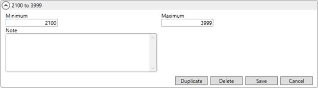 When adding records, the application allows for gaps, but produces an error when there are overlapping ranges. To assist you in creating ranges, the application allows you to create multiple items at once by specifying a starting and ending value along with the size (increment) of each tier. In the example below (Figure 35), ranges will be created from 2000 to 9999 in groups of 1000 (i.e. 2000-2999, 3000-3099, 4000-4099, et al.)
