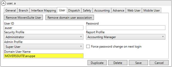 Administrators can view the Windows environment associated to the user through the Domain User Name field found on the User tab within Personnel Setup. In the example below (Figure 23), the record is authenticated through the MOVERSSUITE domain for the aruppe user. This is the domain user that the person logged into Windows using.