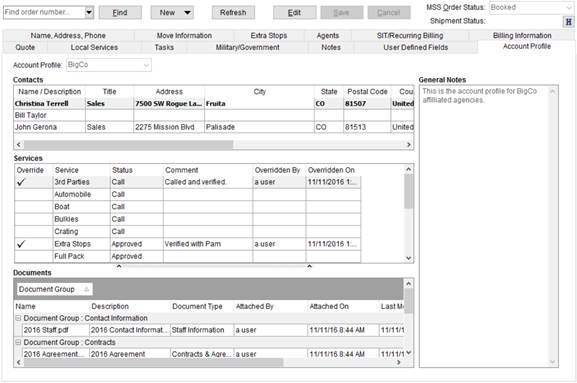 Default values for MoversSuite orders can be automatically set using Account Profiles. The Account Profiles system is comprised the following: