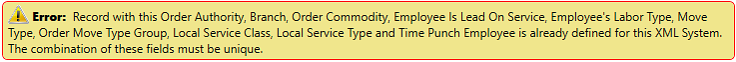 Each XML System Payroll Account Map must be unique. This means at least one field must be different. If a record is attempted to be added that is not a duplicate, this error will occur: