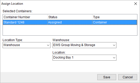 The Assign Location screen is available through a right-click option from Container Management. It allows you to update the location assignments for one or more containers that are currently assigned to an order. You can only update the location of containers assigned to the same order.