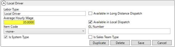 If you wish for a more granular labor expense, then you can assign actual wage values for each of your local crew and drivers you want included in Job Costing. Set the Regular Hourly Wage, Overtime Hourly Wage, and Double Time Hourly Wage within the Accounting tab for the appropriate Labor Type on each employee Personnel Setup record that you want included.