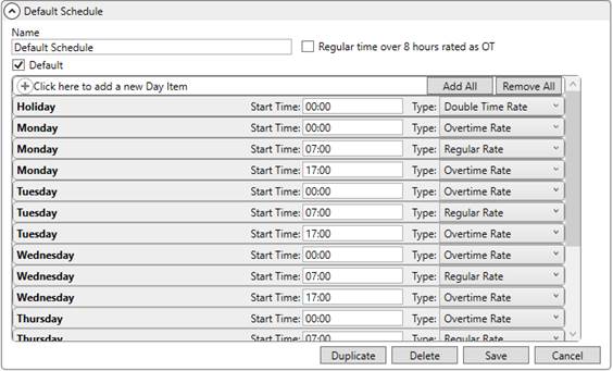 MoversSuite provides a Default Schedule that you can update or copy to create your own schedules. The screen is based on each day of the week and a holiday. You can set time intervals throughout the day to correspond to a specific rate type. Start Time values are measured using 24-hour, Military Time. Using the above example (Figure 17), the following wages are referenced: