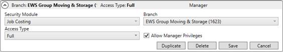 The Job Costing module is not branch specific. Therefore, only one Job Costing specification need be added to a Security Profile Setup record to grant user access to the module.