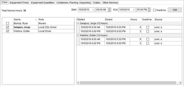 Use this pane to select the crew you wish to add entries for actual time of service. | |