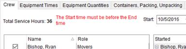 Add Press this button to create a time block entry for the selected crew. The times set for the Start and End dates is assigned to each crew person. Any error pertaining to the entry displays next to the Total Service Hours field.