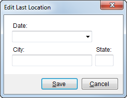 Set and manage the last location that the driver checked in with dispatch through this field. Press Edit to access the following dialog allowing you to set the Date, City (up to 26 characters), and State (two characters).