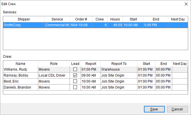 Update estimated crew times and set the lead on a service using the Edit Crew screen. This screen is available by right-clicking on a service within the Dispatch Center tab and selecting the Edit Crew option.
