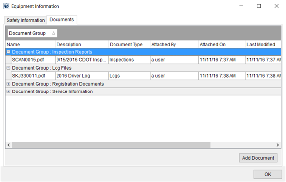 You can add and view documents for personnel through the Documents (Equipment) tab within the Equipment Information screen.