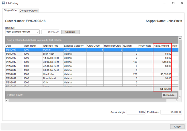 MoversSuite takes costing data assigned to an order through containers, personnel, and other expenses and uses this information to calculate estimated gross margin and the profit or loss on an order. Users, such as dispatchers, can use the Job Costing data to assist in assigning crew, equipment, and materials on Local Services in a manner that contributes to optimizing revenue.