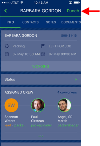 Crew leads have the option to punch in or out one or more person at a time through the Assigned Crew screen.