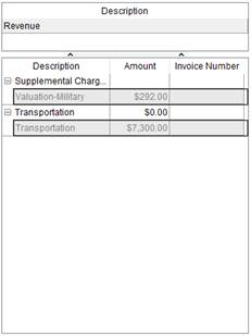 This section lists the items that can display on the invoice based on what is generated through Quotes, Rating Sends, Revenue (example below), and TechMate Imports. Additionally, when invoicing through Claims, additional sources of Receivables and Handling Revenue are also available.