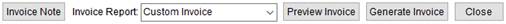 Use this section to create an invoice note that displays on the output report, select a report from those defined within Report Setup, and view and generate the invoice. You can choose between SF1113 Laser, Custom Invoice, and Revenue Invoice etc.