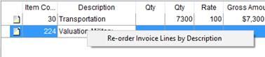You can also utilize a right-click option allowing you to sort invoice items based on their description. Choosing Re-order Invoice Lines by Description, sorts all groups and items (not items within a group) in alphanumeric order based on their description.