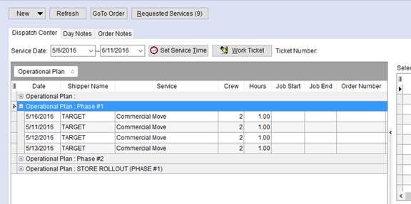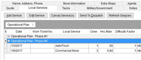 Your company can group services in phases of operations, such as those for a store setup, then send the single plan containing all services to dispatch.