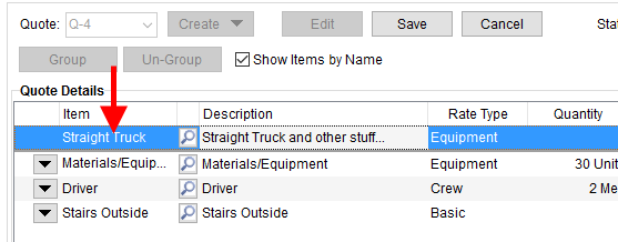 Arrow keys on the right side of the Quote tab allow you to move the selected item or group up or down in the list. The order in which the items and groups are arranged in the details section is how they appear in quote reports and when imported as revenue items in Revenue Entry.