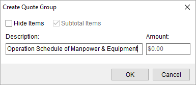 Use the Create Quote Group to combine one or more quote items into a single line item (Hide Items checked) or list all the items under a specific Description. Optionally, provide a dollar Amount when Hide Items is checked and Subtotal Items is unchecked; use this if you wish to list the items without charge and write-in your own dollar amount for the collection of items.
