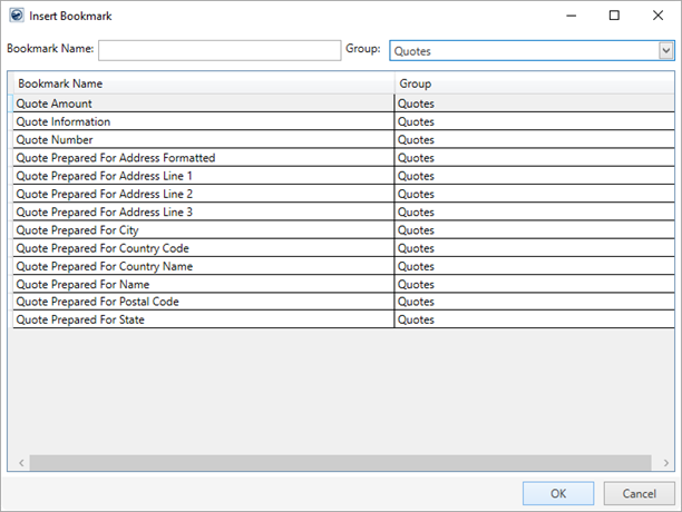 Figure 22: Displaying the Quotes group within Insert Bookmark