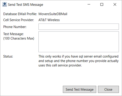 Test the service provider and related SQL Server email profile by providing the cell number and text message and by pressing Send Test Message. The Status informs you of what fields are missing and whether the message was sent. Confirm the results of the test by checking the device associated to the Phone Number for receipt of the specified message.