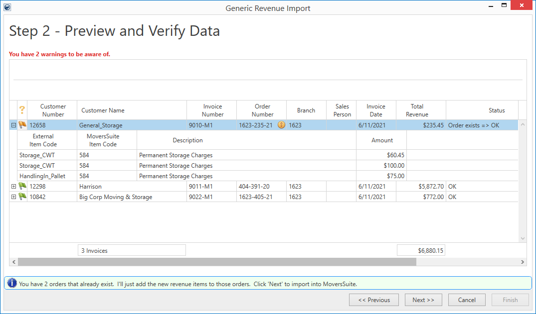 From this window, you can confirm the customer and order information along with viewing the item and grand revenue totals. Nothing has been imported into MoversSuite, so if changes are needed, press the Previous button, make changes either to the Generic Revenue Import File, or within MoversSuite Administration, and then press the Next button from Step 1 to reprocess the data.