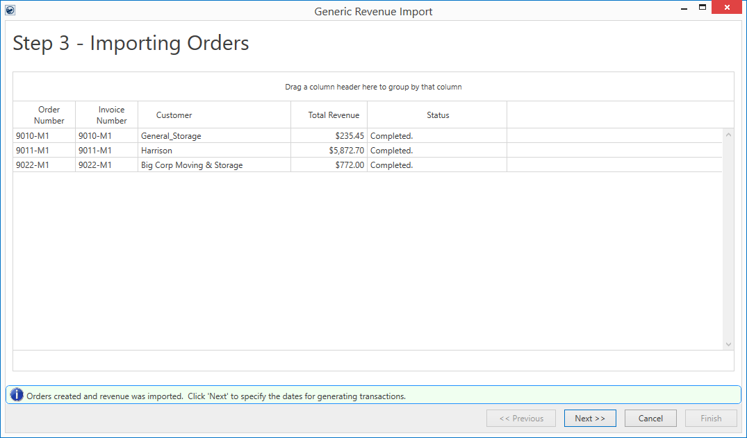 The Status column provides information on whether the import has completed for the line along with any errors or warnings that an order may receive. At this point, the Previous button is disabled. If any corrections are needed to be done to the orders, then they must be done manually outside of the Generic Revenue Import window.