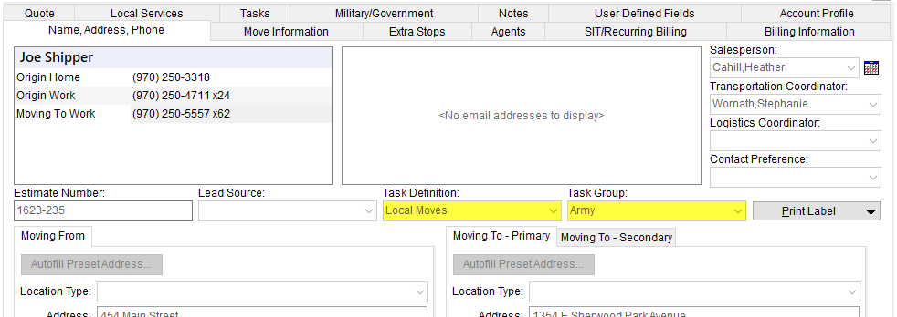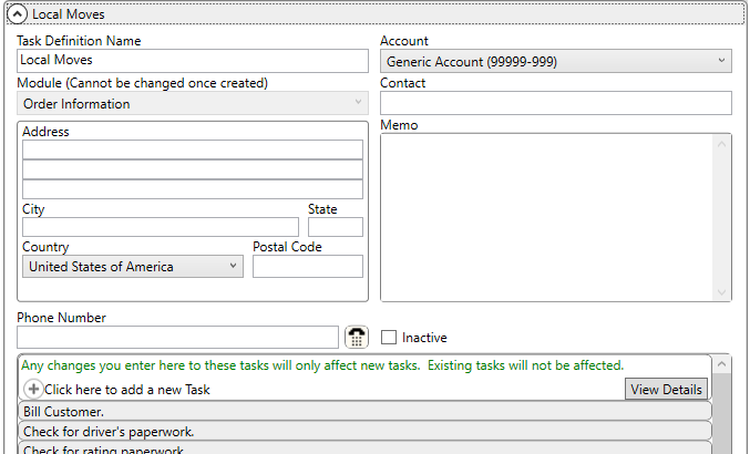 Establish a template of to-do items, within the Tasks Setup. The Task Definition Name is considered a template of to-do items and is assigned to an order through the Task Definition setting within the Name, Address, Phone tab and through Account Profile Setup. The Module determines whether the record is available through the Claims or through the Order Information module (Order Information applies to all non-Claims modules, including International Orders, Office & Industrial, Order Information, and Special Services).
