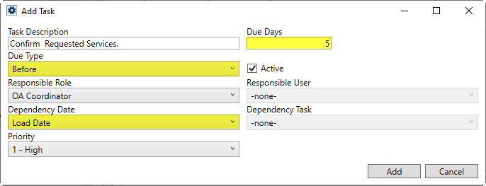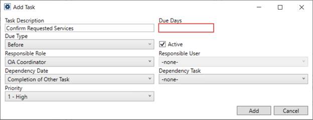 Next, build a list of Task items. These are the individual to-do items that comprise the workflow of personnel. The application computes a due date for the item as the number of Due Days before or after (based on the Due Type) of the Dependency Date. In the example below (Figure 17), a task of Confirm Requested Services shows up within the Tasks and Workflow grids with a due date that is five days before the Load Date set on the order. The task is assigned to the OA Coordinator set on the order, as well.