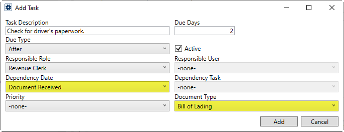 If you wish to assign the due date of task based on when a document is added to the system, then you can choose the Document Received option from the list of Dependency Dates. Choosing the Document Received option enables the Document Type setting, from which you can choose the type of document that triggers setting the due date on the task item. In the following example, when a document of type “Bill of Lading” is added to the order, a new task is added to the order with the due date set to what is specified on the detail item.
