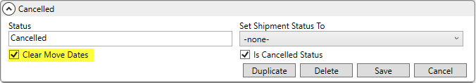 Setting the Clear Move Dates flag within Order Status Setup regenerates the list of tasks when the order status is changed. If the Is Cancelled Status flag is also set, then the application removes (or clears) all Tasks items.