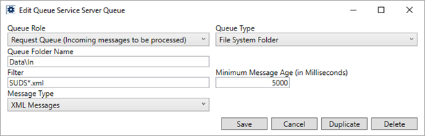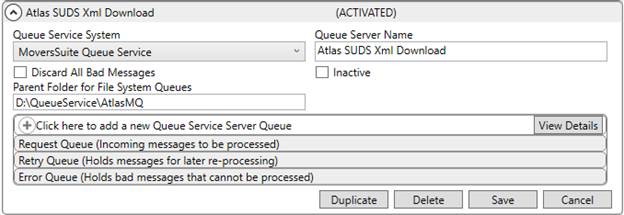 Establish a queue service for the Atlas SUDS Xml Download within Queue Service Server Setup. This record defines the process and the folders referenced for XML files. Provide the specified options to enable the Atlas queue service.