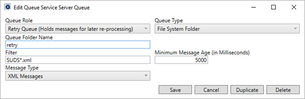 Provide the sub-directory for message files that failed to download and are placed in a queue to re-attempt the download. This sub-directory lists beneath what is specified for the Parent Folder for File System Queues. For example, if you set this to retry and the parent folder is D:\QueueService\AtlasMQ, then the application puts the retry files within the D:\QueueService\AtlasMQ\retry directory.