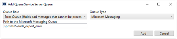 Provide the path to the directory for message files that cannot be reprocessed, e.g. .\private$\suds_export_error. This is generally a private folder within the Microsoft Queuing System folder structure.