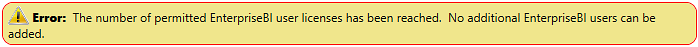 The recommendation to remedy this is to check the employees listed in EnterpriseBI User Setup, which is the list in MoversSuite Administration > Reports > EnterpriseBI User Setup showing users who are currently using a license or at one time used a license. Check to see if a user is listed who no longer needs that license or perhaps is no longer with your company. If one is located, click on that profile to see what the Role is listed. If the Role is not set to Disabled, choose Disabled, which ends this user’s access to the BI Tool. Subsequently, the license that user was using is no longer in use and is available for use by another employee. If there is not an available license, please contact sales@ewsgroup.com  to purchase additional licenses.