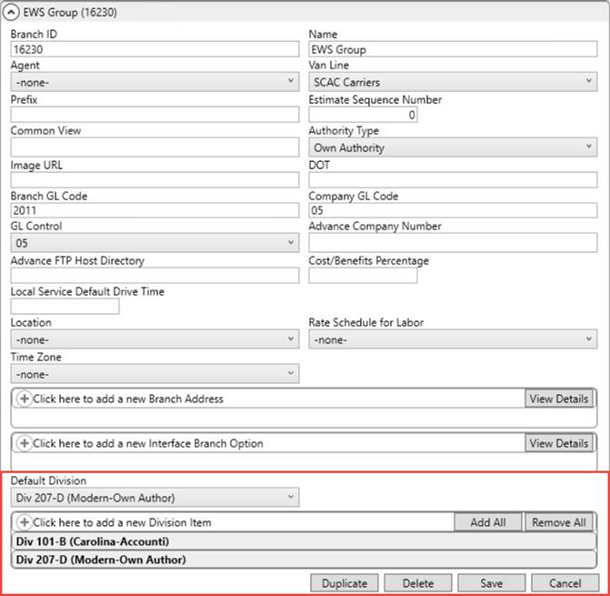 This is a special section only visible when the Divisions are turned on. Refer to Divisions Setup and Administration for setting up Divisions. You can use this section to link the current branch record to Division records (defined within Division Setup). These Division records will appear as options on orders and transactions associated to the branch.