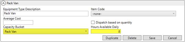 Once resources are assigned to the service through Local Dispatch, the application references the Capacity Bucket and Hours Available Daily settings for each Equipment Setup record.