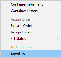 Export To Export the contents of the grid to view and manage through an external application, such as Microsoft Excel. Refer to the Export To topic for details. NOTE: This option is also available through the History tab within Container Information.
