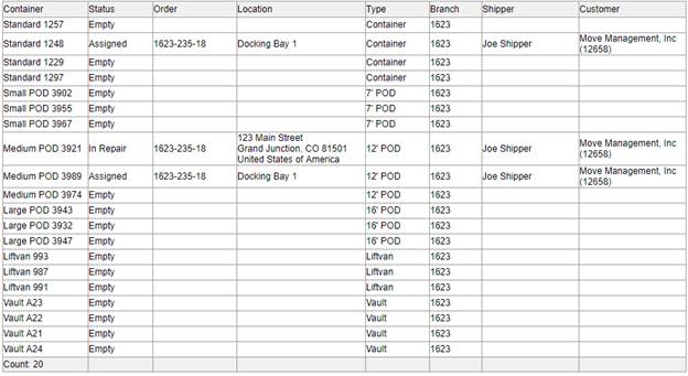 The Container Management screen allows you to view and manage containers within MoversSuite. This includes the ability to assign and release containers from orders, modify the status of container, create reports of container tracking, and more.