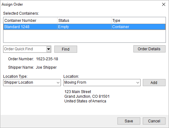 The Assign Location option allows you to update the location of an assigned container. As with Assign Order, you must select a Location Type and then choose a Location or Warehouse/Location.