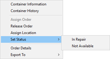 Set Status Assign a Status value to the container from the list of those defined within Container Status Setup. Of note, the application automatically sets the Status of Assigned or Empty when either Assign Order or Release Order is performed.