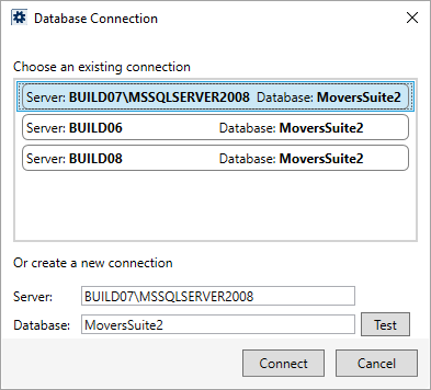 Select from the list of those recent connection to MoversSuite Administration. Selected records populate the Server and Database settings where they can be modified and tested.