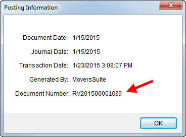 The following image of the Posting Information dialog highlights a MoversSuite Document Number.