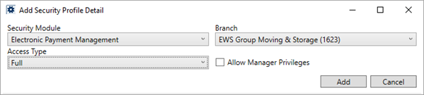However, these users can only add records for branches to which they are assigned to the Electronic Payment Management module. Therefore, assign the Electronic Payment Management module to each profile for each branch that you wish people to be able to add records through the following: