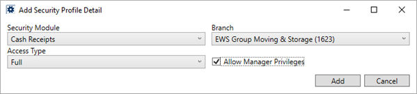 Since Electronic Payments generate Cash Receipts batches and utilize other Cash Receipts functions, each person you wish to process payments must have Full access to the Cash Receipts module for each supported branch. Additionally, set the Allow Manager Privileges flag to allow employees to refund and void Electronic Payments.