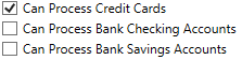 For example, if you want only the Credit Card option available, place a checkmark next to “Can Process Credit Cards” and leave the two bank options unchecked.