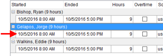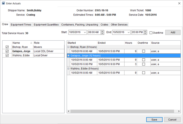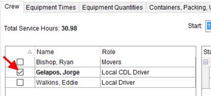 Open the Crew tab to view and set the actual times for personnel assigned to the service. |