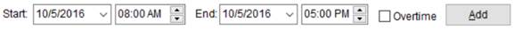 Enter appropriate data next to the Add button. This is the data you wish to enter for the selected/checked record. NOTE: If the service time crosses the midnight boundary, confirm this by entering an appropriate End date, i.e. the next day.